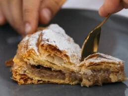 Le gâteau feuilleté à la Frangipane façon Artigarrède, une crème pâtissière amande et noisette parfumée au rhum, sur vos tables toute l’année.
